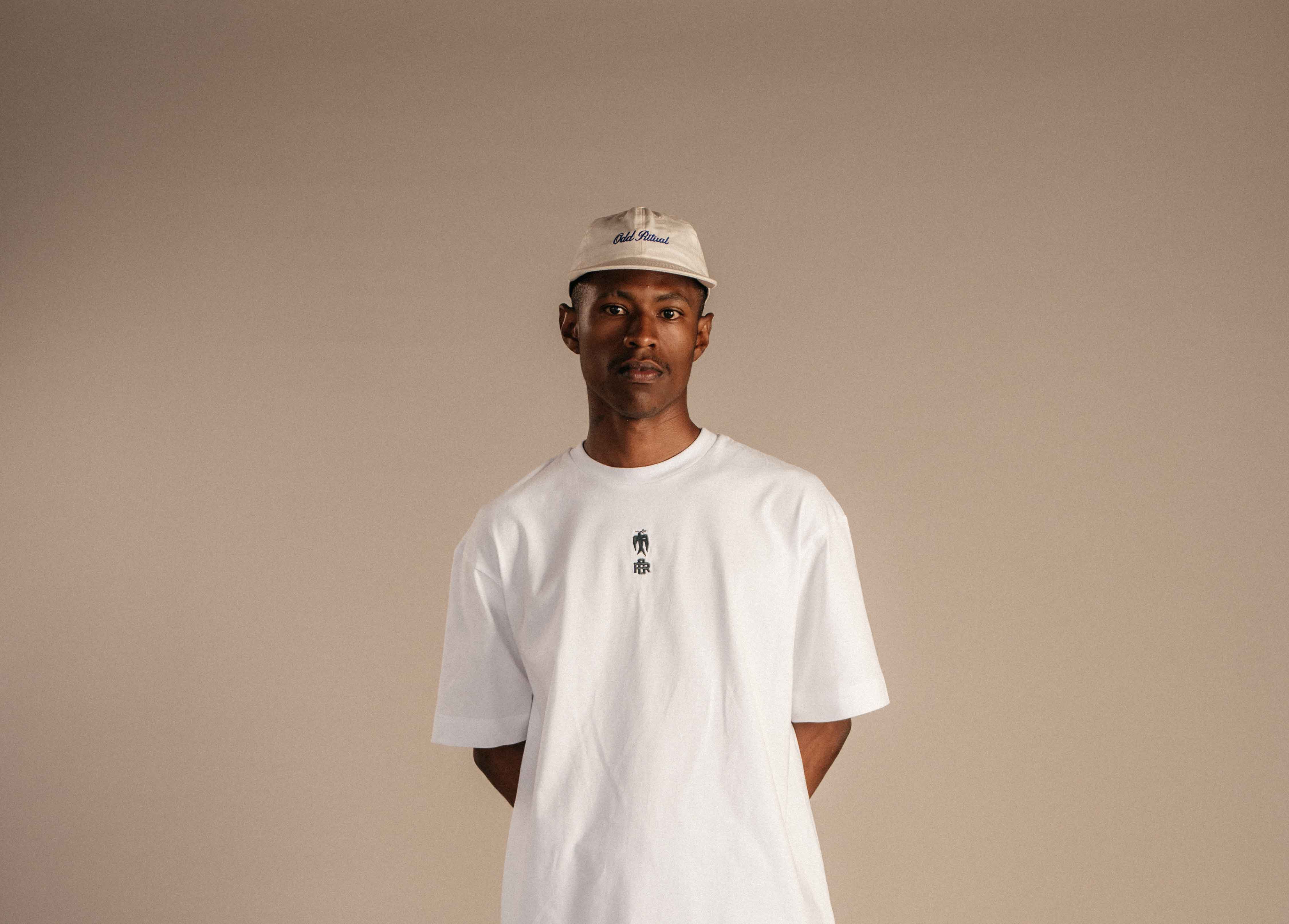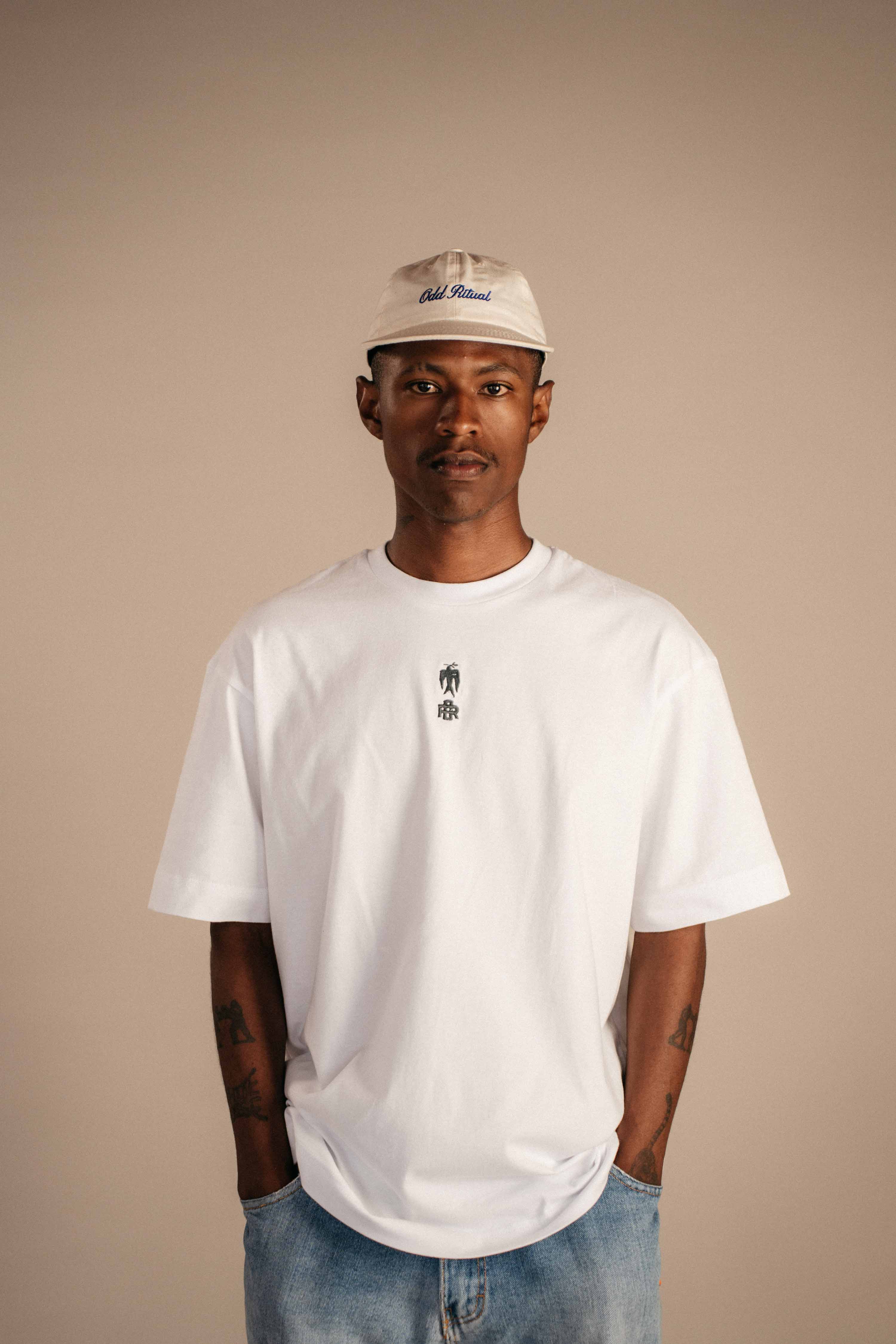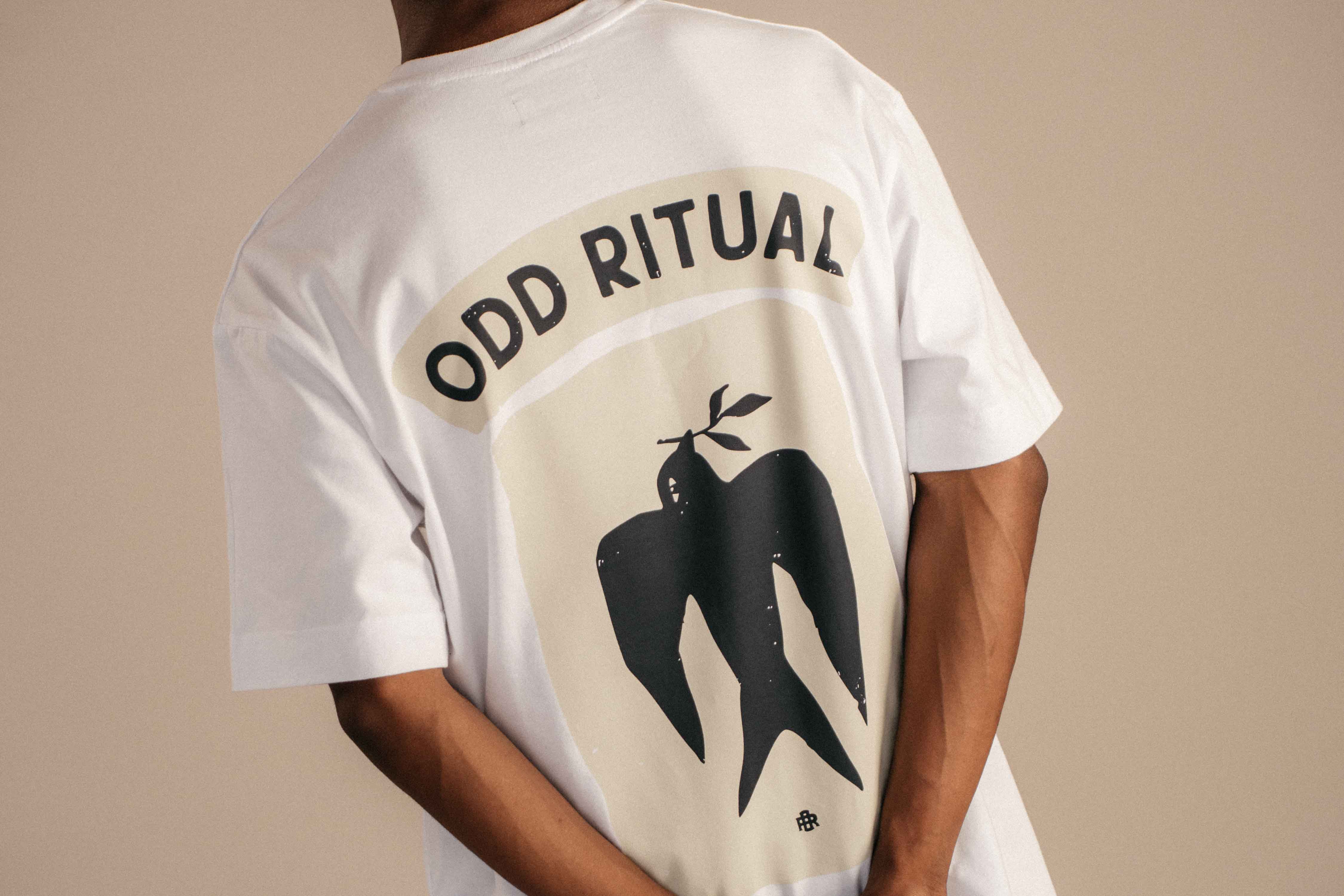 Our newest White T-Shirt, designed with our signature relaxed, boxy fit. The front is kept minimal, finished with a small navy embroidery at the centre of the chest. On the back, a bold graphic anchors the piece — an expression of Odd Ritual’s visual language and cultural intent.